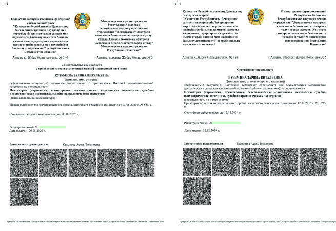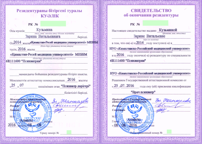 Допуск к работе по специальности: Психиатрия (наркология, психотерапия, сексопатология, медицинская психология, психиатрическая экспертиза, судебно-наркологическая экспертиза)